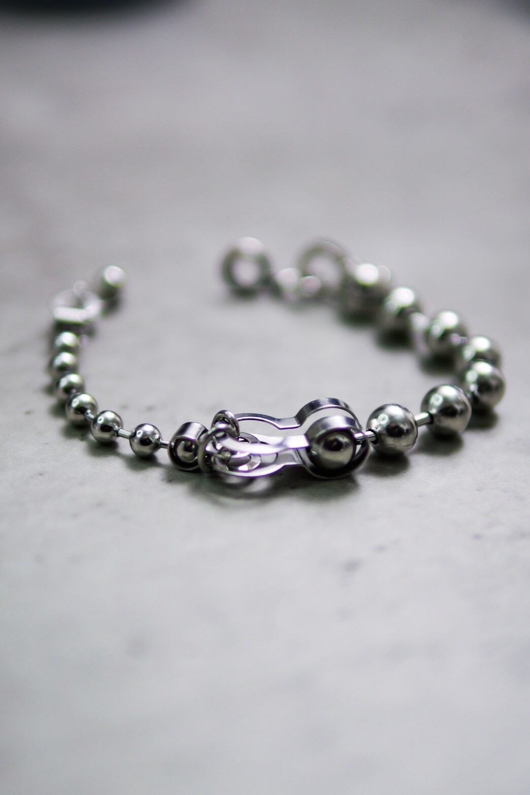 左右でボールチェーンの大きさが異なるありそうでなかったデザインのブレスレットになります。
